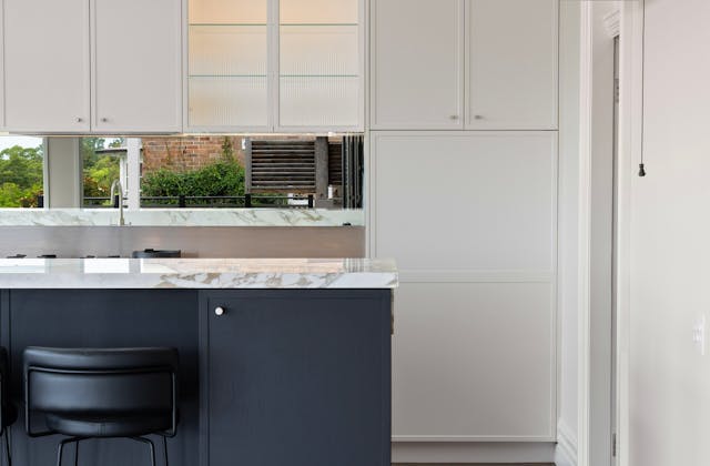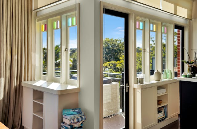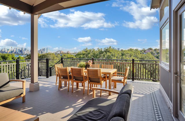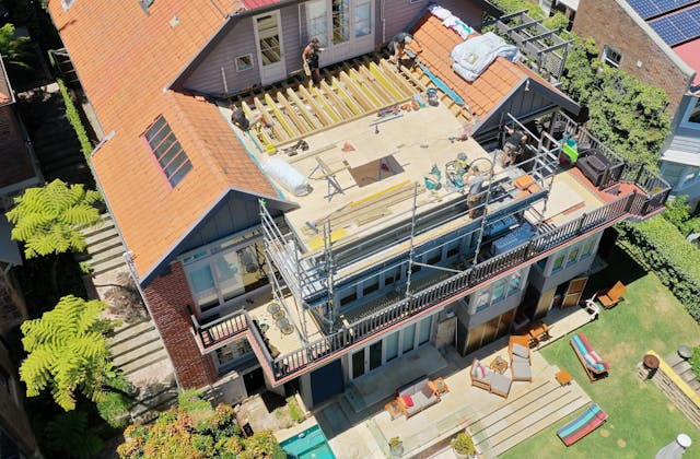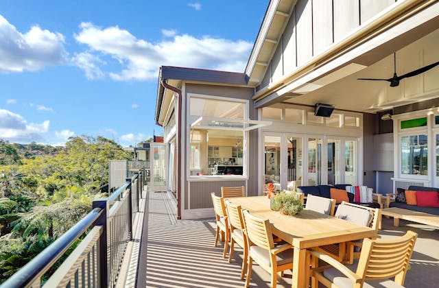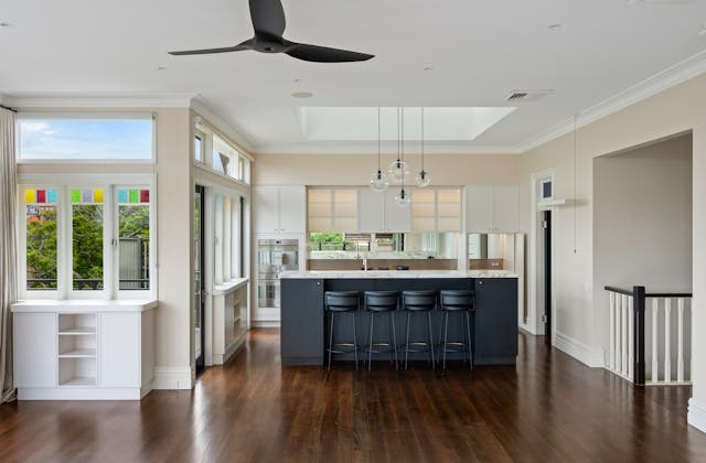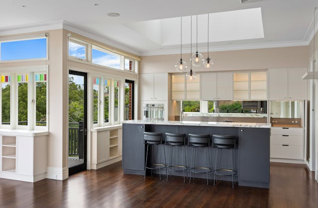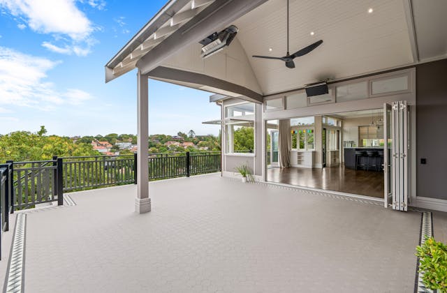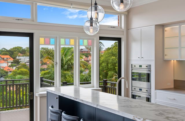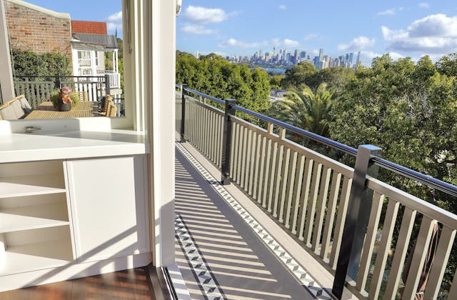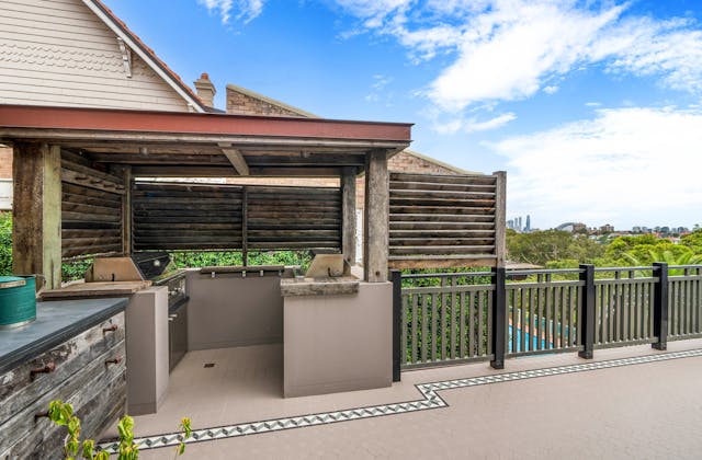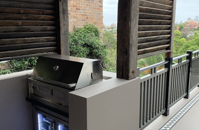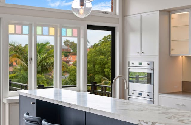 'HADLEIGH' a c1908 heritage home in Mosman. This project entailed the restoring of original heritage components such as ornate timber trims, flooring and plaster work. We replaced the kitchen, butler's pantry, laundry, bathrooms, bedroom joinery, over 120m2 of tesselated tile balconies, powdercoated aluminium balustrades, tile and copper roofing and guttering, custom stained glass timber windows and doors throughout and created some new entertaining zones, like our favourite - the rustic recycled timber barbecue area and a one-of-a-kind sandstone firepit. We also dealt with damp issues by installing extensive sub floor drainage and ventilation. The project was finished off with some structural landscaping components, along with horticultural design and implementation.