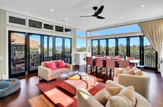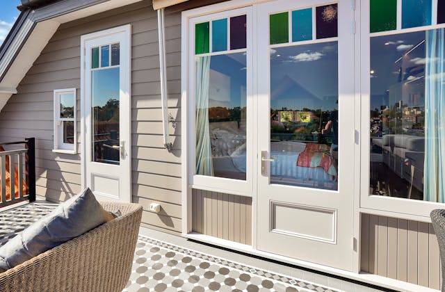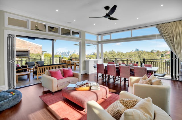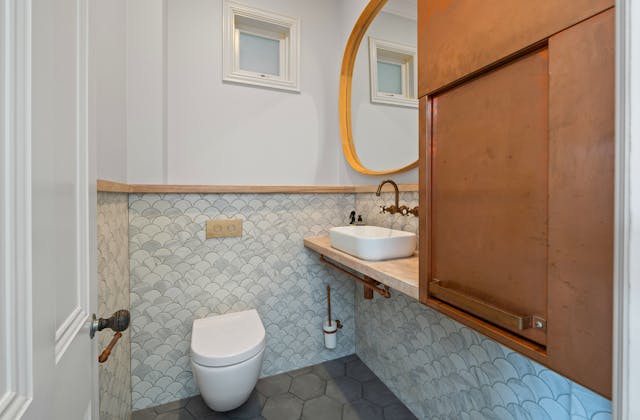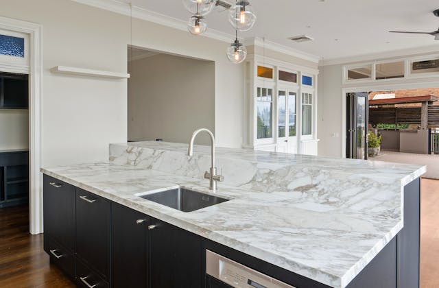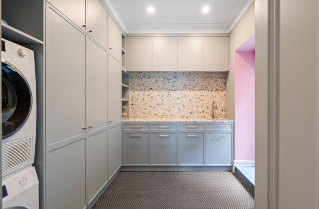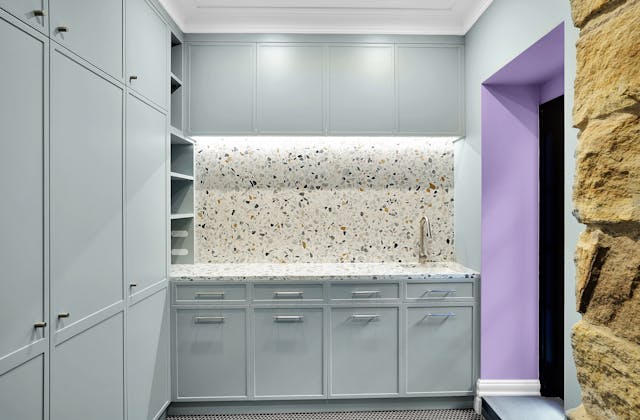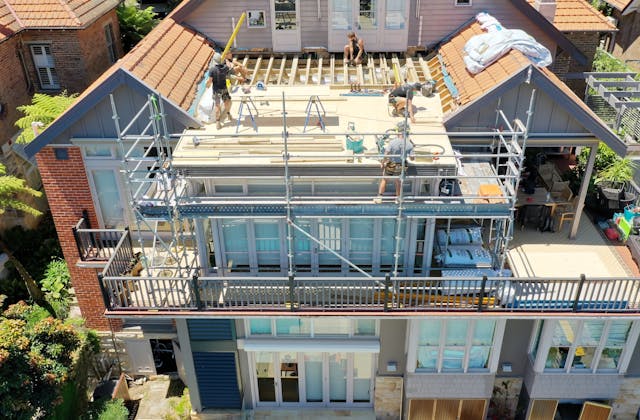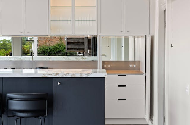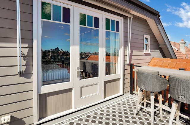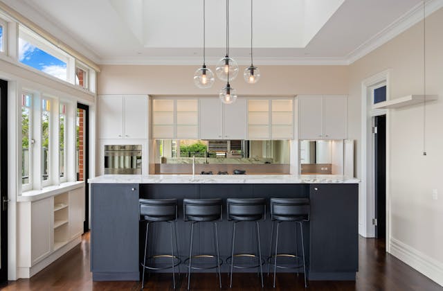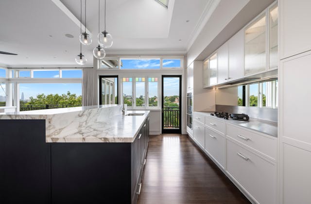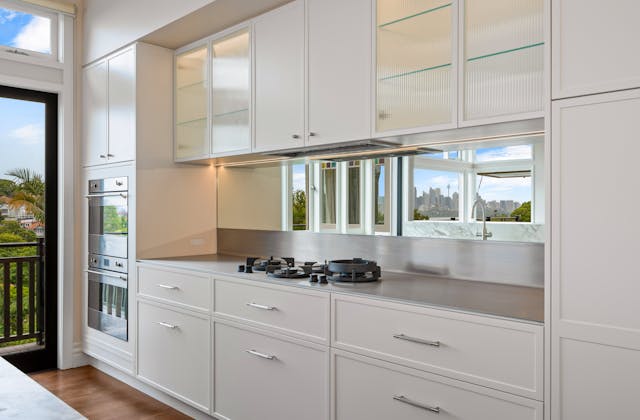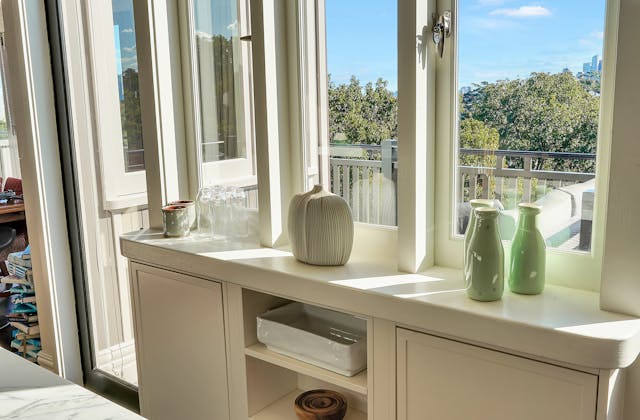 'HADLEIGH' a c1908 heritage home in Mosman. This project entailed the restoring of original heritage components such as ornate timber trims, flooring and plaster work. We replaced the kitchen, butler's pantry, laundry, bathrooms, bedroom joinery, over 120m2 of tesselated tile balconies, powdercoated aluminium balustrades, tile and copper roofing and guttering, custom stained glass timber windows and doors throughout and created some new entertaining zones, like our favourite - the rustic recycled timber barbecue area and a one-of-a-kind sandstone firepit. We also dealt with damp issues by installing extensive sub floor drainage and ventilation. The project was finished off with some structural landscaping components, along with horticultural design and implementation.