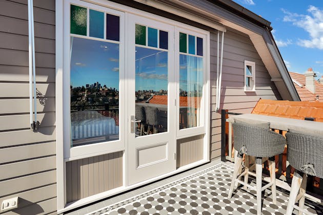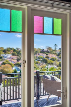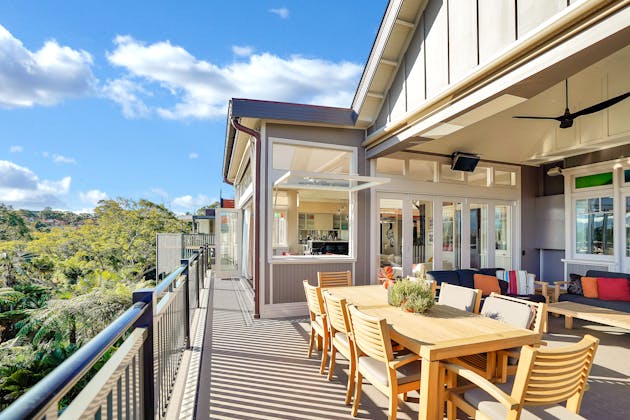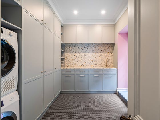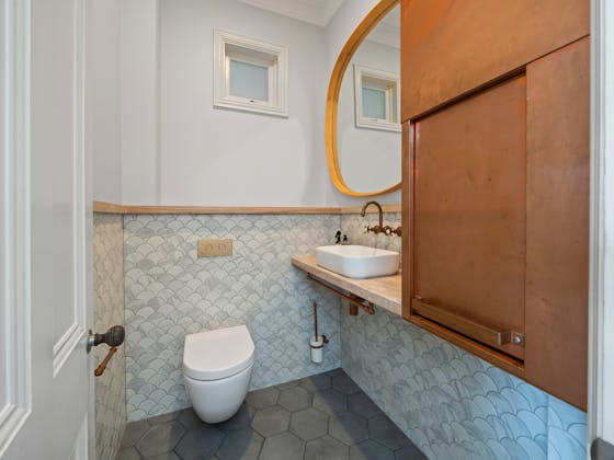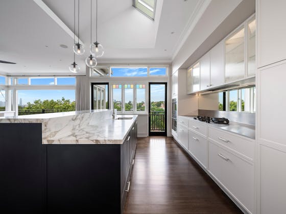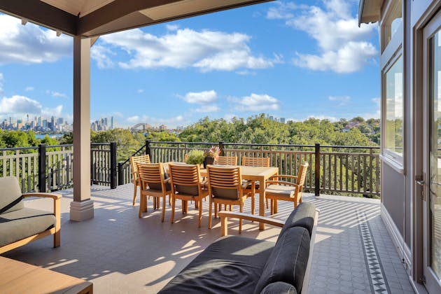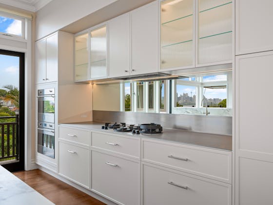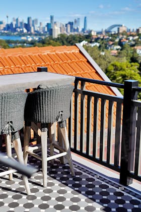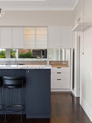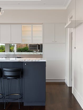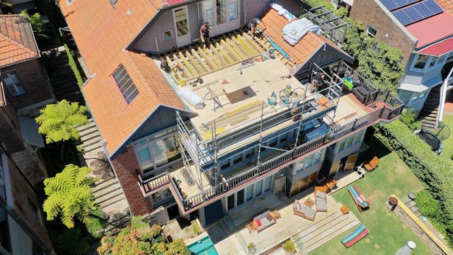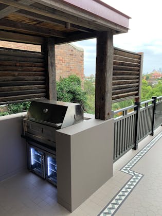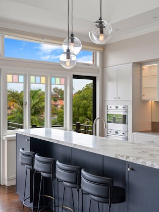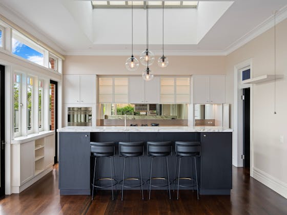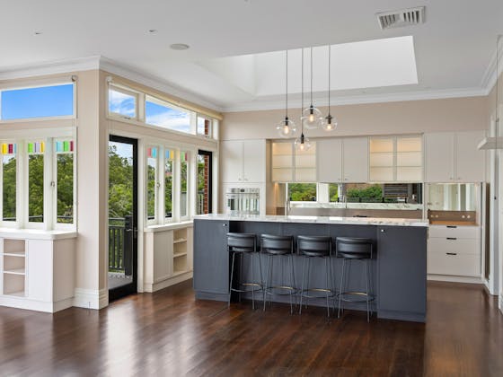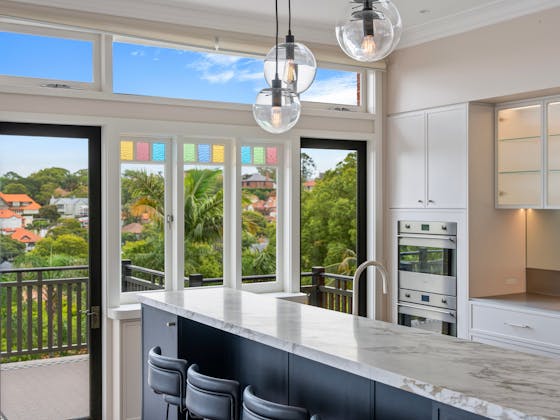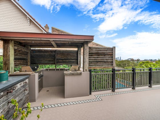 'HADLEIGH' a c1908 heritage home in Mosman. This project entailed the restoring of original heritage components such as ornate timber trims, flooring and plaster work. We replaced the kitchen, butler's pantry, laundry, bathrooms, bedroom joinery, over 120m2 of tesselated tile balconies, powdercoated aluminium balustrades, tile and copper roofing and guttering, custom stained glass timber windows and doors throughout and created some new entertaining zones, like our favourite - the rustic recycled timber barbecue area and a one-of-a-kind sandstone firepit. We also dealt with damp issues by installing extensive sub floor drainage and ventilation. The project was finished off with some structural landscaping components, along with horticultural design and implementation.